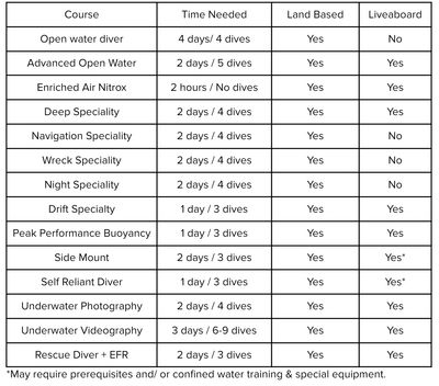 We encourage you to contact us for dive training as we would give you the best advice on how to go about it. The PADI courses we offer are in the table above. We currently train in Phuket, Thailand but we do offer these courses even our the trips organised by us. Please note that some of the liveaboards may restrict certain courses to meet with local dive regulations.